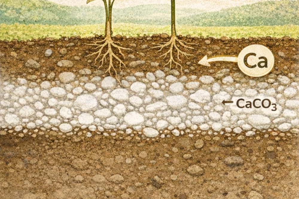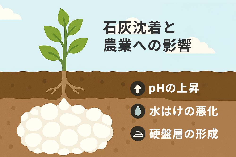 土壌中に炭酸カルシウム(CaCO3)が蓄積し、 作物の根の伸長や養分吸収に影響を与えます。